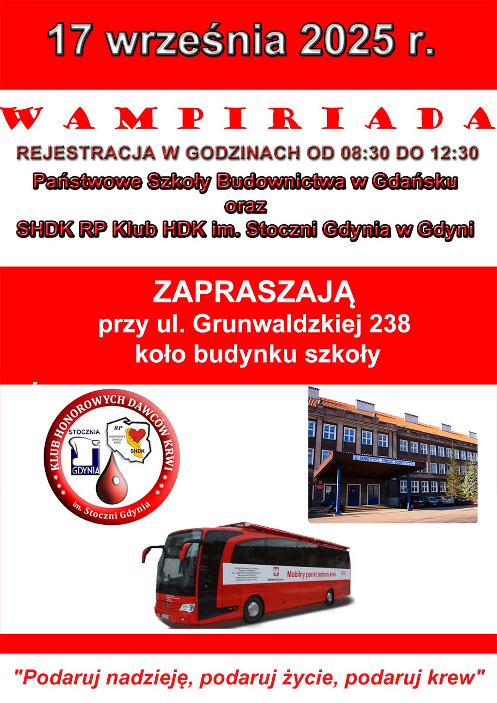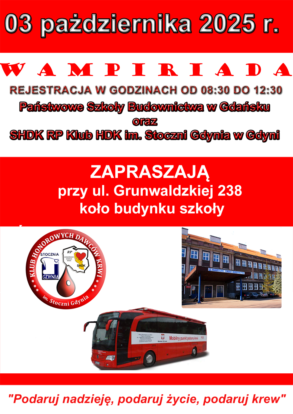 W dniu 3 października 2025 r. odbyła się akcja poboru krwi w Państwowych Szkołach Budownictwa w Gdańsku przy ul. Grunwaldzkiej 238.